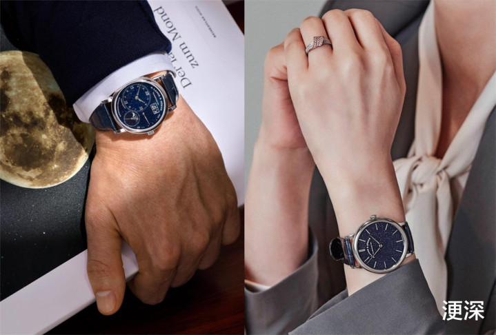 当朗格将浩瀚星河凝于腕间,配备蓝色砂金石玻璃表盘的腕表便成为最深邃的七夕情书。LANGE 1朗格1小型款月相腕表以直径为36.8毫米的750白金表壳承托起这片微型宇宙,5时位置的月相盘如银钩悬空,并饰有628颗繁星,与表盘的星河相互映衬。在精密齿轮驱动下,月相显示精准度长达122.6年;SAXONIA萨克森纤薄腕表配备直径为39毫米的750白金表壳,表盘上两根纤细的柳叶形指针恰似鹊桥双星,在深蓝背景中划出柔光轨迹。矿物晶体在表盘上折射出万千幽蓝光点,宛如夜幕中永不坠落的星辰。这诞生于高温熔融与缓慢冷却的结晶艺术,恰似真挚情感历经时间淬炼后的璀璨永恒。